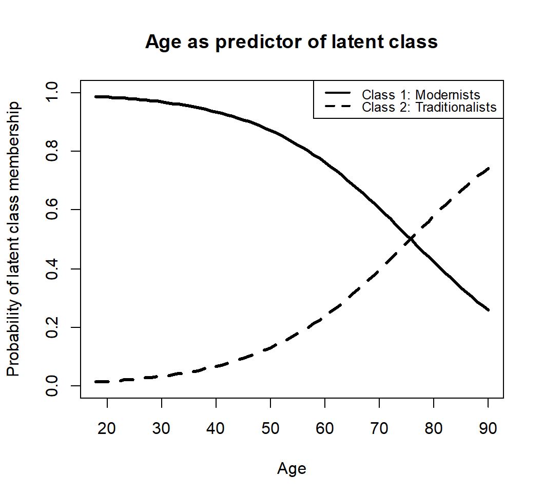 Finally, the graph below shows the modelled effect of age on latent class membership. As age goes up, the probability of being a traditionalist increases while that of being a modernist declines.