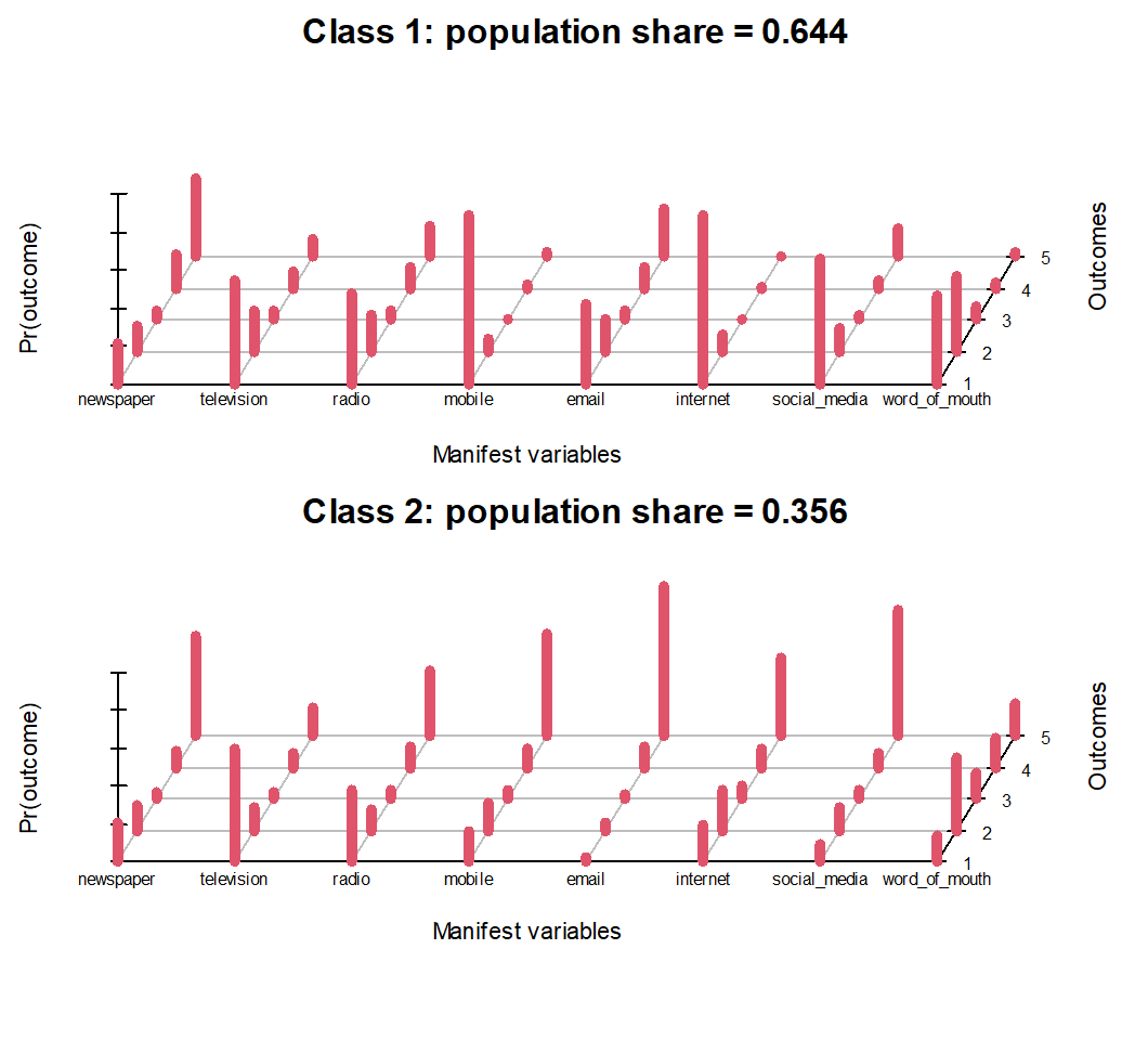 Can we use this to create a segmentation of types of consumer? Latent class analysis was applied, using the polCA package in R. Two classes were identified based on the Bayes Information Criterion (BIC). Results are presented graphically below.