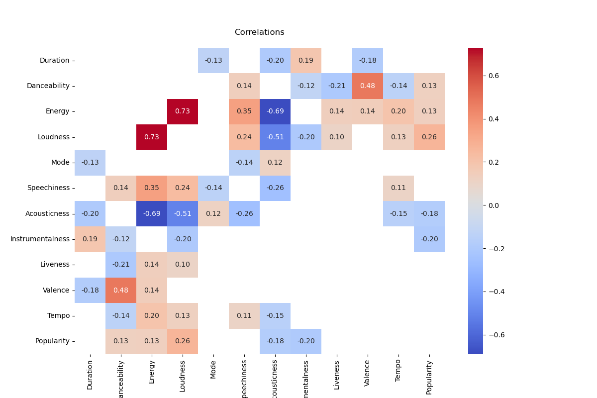 How do all these variables inter-relate? The figure below presents their spearman correlation coefficient matrix (between -0,1 and 0.1 omitted).  The strongest correlation is between energy and loudness – music that is more energetic tends to be loud. But these are both negatively associated with ‘accousticness’. Generally, music that is more danceable tends to be more positive (valence) although the correlation is moderate. Otherwise, there are mostly weak to moderate correlations for the other variables. Most interestingly, popularity does not strongly correlate with other variables, with the strongest being with loudness at 0.26. Louder music is more popular, to some extent. I guess there is no accounting for taste.