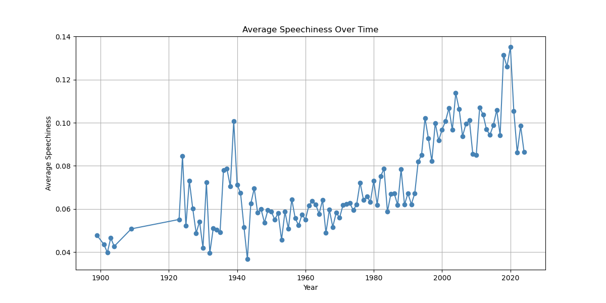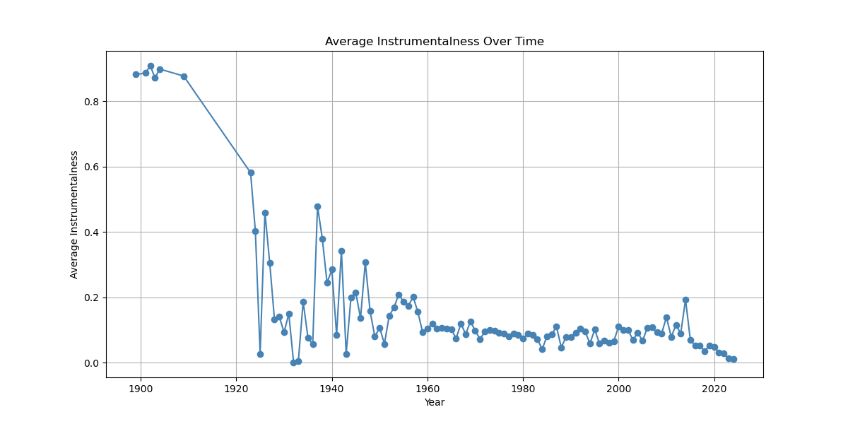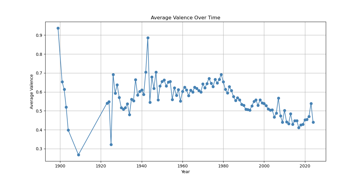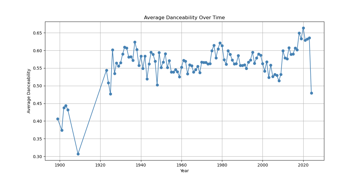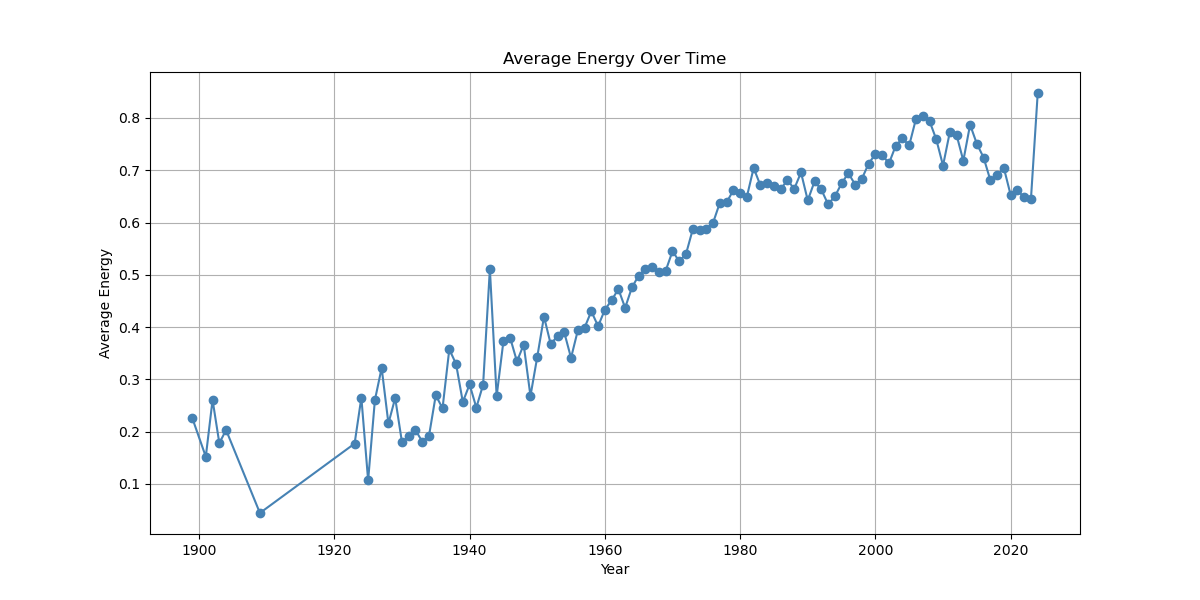 Spotify also contains a metric that measures the danceability of a song – how suited it is for dancing, ranging from 0 to 1. As seen below, this shot up from the early 1900s to 1940 before holding roughly constant at around 0.55 to 0.66 on average, until around 2000. Since then, it has increased to a high of over 0.65. Note there is an outlier for 2023, something observed for this datapoint across metrics.