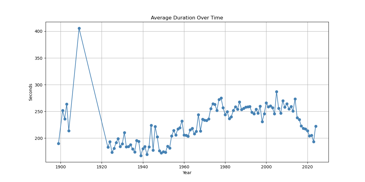 As seen in the graph below, the average duration of a had risen from about the 1940s right up to the 1980s, before plateauing up until the late 2000s; thereafter the average duration declined sharply. This decline coincides with the advent of streaming – as more music is available, musicians produce less to account for conflicted attention spans.