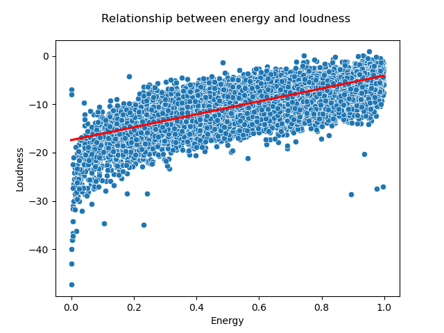Finally, the graph below shows the relationship between loudness and energy indicating the strong correlation between them.